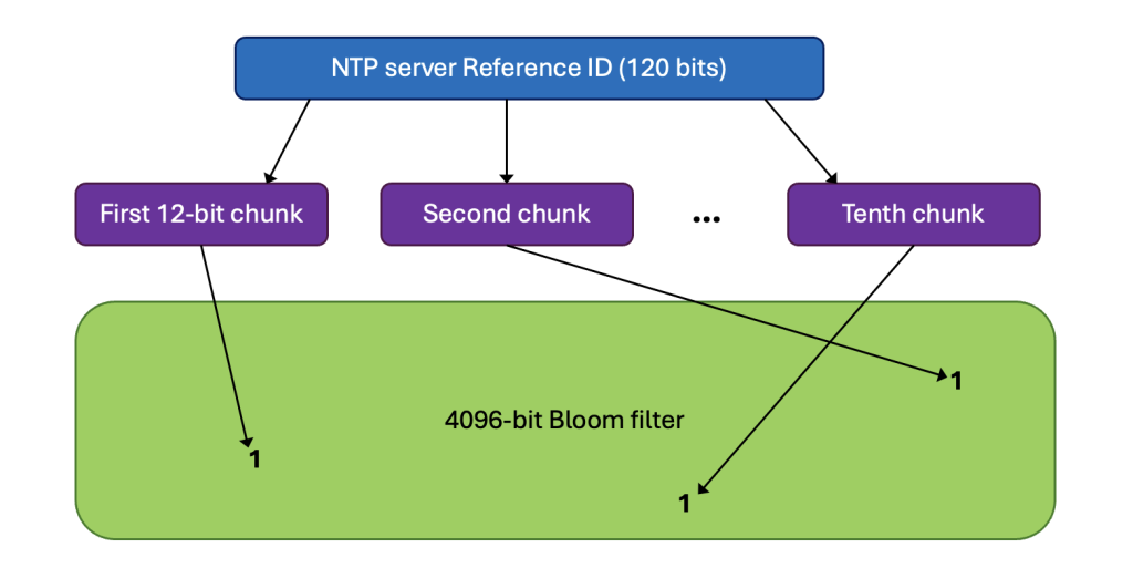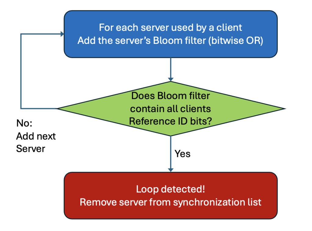 Here’s how it works. Each NTP server has a randomly generated 120-bit Reference ID. It first initializes its Bloom filter to all zeros. Then it adds its Reference ID to the filter by dividing it into 10 12-bit chunks. The value of each chunk points to a bit address in the filter, and that bit gets set to 1. Kind of confusing but perhaps Figure 3 will help to clarify the procedure. The Bloom filters for all servers used as a source of time are added using a bitwise OR. After all this the filter bits will be 1 if any of the servers Reference ID chunks point to that bit. This is the filter version that the server sends to its clients. The clients do not add its own Reference ID to its Bloom filter but adds the filters from all its servers. Each time a client adds the filters from one of its servers it can check to see if all the bits corresponding to the clients own Reference ID are set. If they are there might be time loop and that server is removed as a source. See Figure 4.