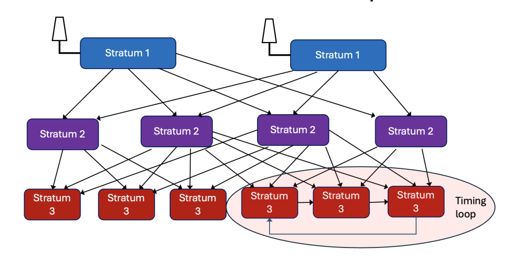 Unlike PTP, with its Best TimeTransmitter Clock Algorithm (aka BMCA), NTP servers can be organized any way the network designer wishes. Go ahead, express yourselves. However, that means that there is a possibility of creating a timing loop, as in Figure 2. And that is bad, since an NTP server that is partially synchronized to itself can end up amplifying its timing errors in a positive feedback loop. This can happen more easily than you might think, especially over time as NTP servers get added, subtracted, and reconfigured.