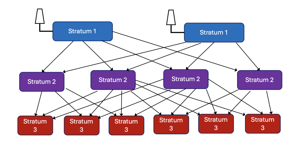 NTP deployments of larger networks usually have NTP servers connected in a tree structure, such as the one in Figure 1. Note that the Stratum 1 servers typically have a GNSS time source, but the higher Stratum servers do not. Instead, they act as both a server and a client. The point of this is to prevent the Statum 1 servers from getting overwhelmed by too many NTP requests.